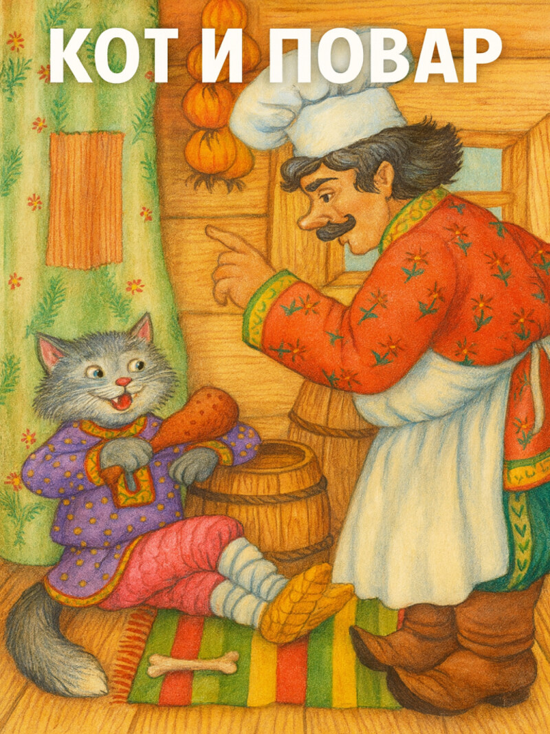 Однажды повар пошел в кабак, а стеречь еду от мышей оставил кота Ваську. Когда он вернулся, увидел, что Васька ест жаркое из курицы. Повар стал Кота бранить, стыдить, призывать к его совести, пугать. А в это время кот Васька спокойно доел курицу.