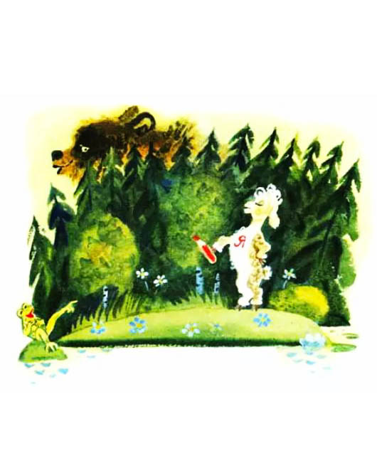 Взял барашекКарандашик,Взял и написал:«Я — Бебека,Я — Мемека,Я медведяЗабодал!» Испугалися зверюги,Разбежалися в испуге. А лягушка у болотцаЗаливается, смеётся:«Вот так молодцы!» Иллюстратор…