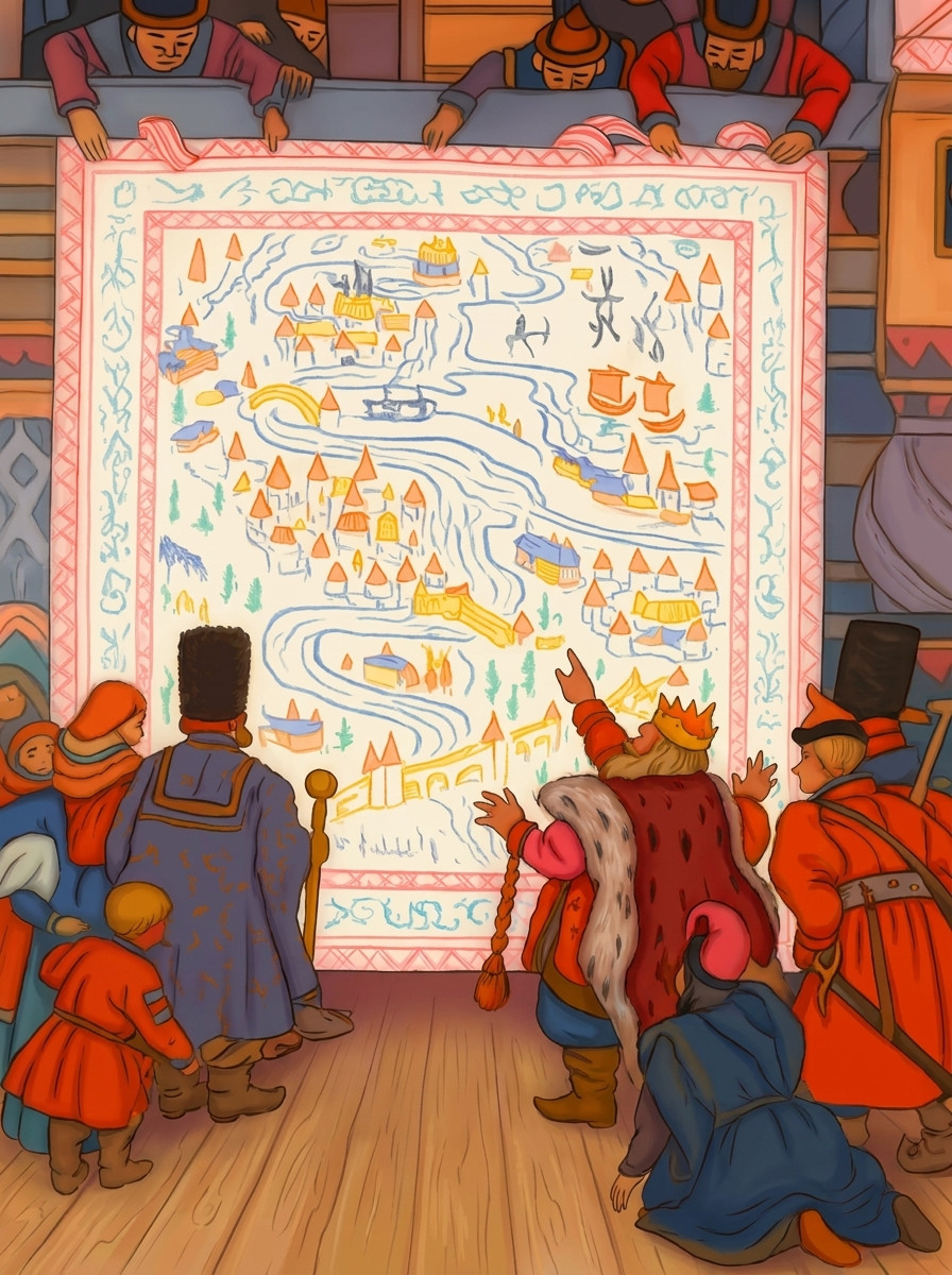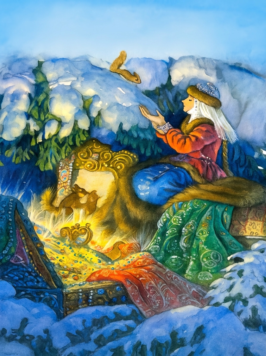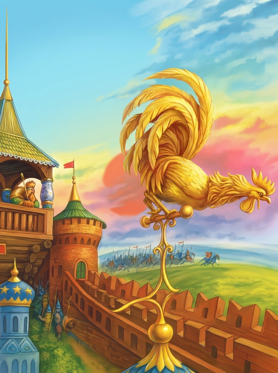 Сказка о царе Дадоне, который долго правил, совсем состарился. Стали его враги беспокоить, на царство посягать. Обратился он за помощью к мудрецу, который подарил царю золотого петушка. Птица сидела на спице смирно. Но при приближении врага поворачивалась в сторону опасности и поднимала гребешок. Однажды петух забеспокоился и Дадон послал на восток войско со старшим сыном, потом и с младшим. В третий раз поехал сам. Увидел побитые войска и своих мертвых сыновей возле шатра. А в шатре встретил прекрасную Шамаханскую царицу, которая тут же околдовала его, и он забыл обо всем. Увез Дадон ее в свое царство, позвал замуж. Встретился им по дороге мудрец и попросил дань за петуха – Шамаханскую царицу. Дадон отказал и ударил звездочета. А петух слетел со спицы, клюнул царя в темечко и улетел…
