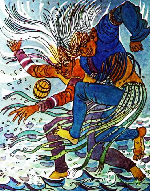 Сказка-легенда о байкальских ветрах - Култуке, Баргузине и Сарме. Раньше над рыбными угодьями хозяйничали ветры-великаны - Култук и Баргузин, хорошие приятели. Любили они друг к другу в гости ходить - поиграть, повеселиться. А для забавы была у них одна на двоих игрушка чудесная - омулевая бочка: куда плывет она, туда и омули неисчислимыми косяками тянутся, будто в бочку ту сами просятся. Это и забавляло великанов. Но однажды полюбили богатыри Сарму, горную богатыршу, хозяйку Малого моря…