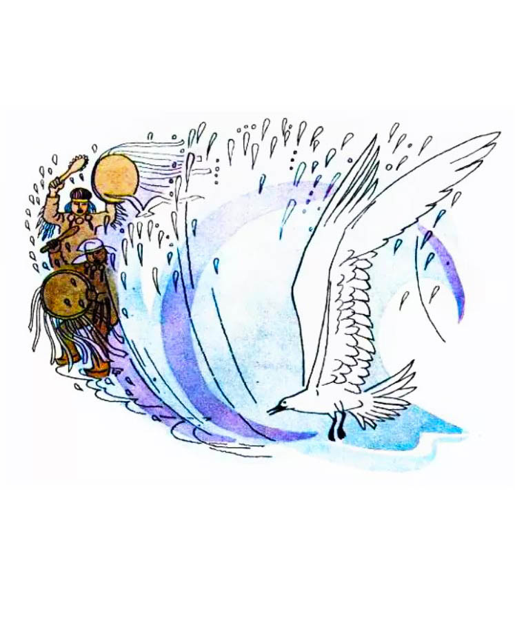 Сказка написана В. Стародумовым по мотивам бурятского фольклора. Свирепый северный осенний ураган занес необычных размеров чайку на Байкал. Она сильно затосковала по родному Ледовитому океану. Чайка громко и тоскливо кричала в небе и наводила на всех щемящую тоску своими криками...