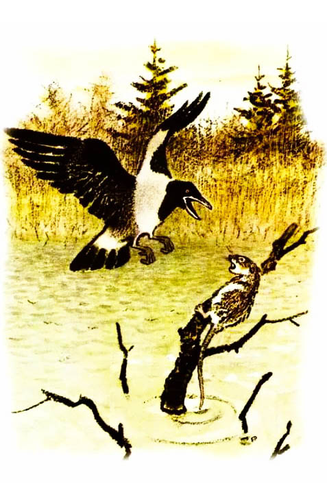 Охотник убил малиновку. У нее в гнезде остались маленькие птенцы, которые погибнут от голода и холода без мамы. Под деревом сидела Лиса и жалела птенцов. Она стала уговаривать других птиц помочь сироткам: кукушке устелить перышками гнездо, жаворонку приносить зерна с полей, горлинке заботиться о них, как мать, соловью петь им колыбельные песни. Тут птенцы случайно выпали из гнезда, и Лисица их тут же съела.