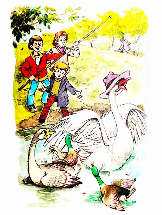 Как-то раз Дениска пошел на пруд покормить птиц. На скамейке сидел мужчина и играл в шахматы сам с собой. С его шляпой произошла неприятность, но Дениска нашел выход.