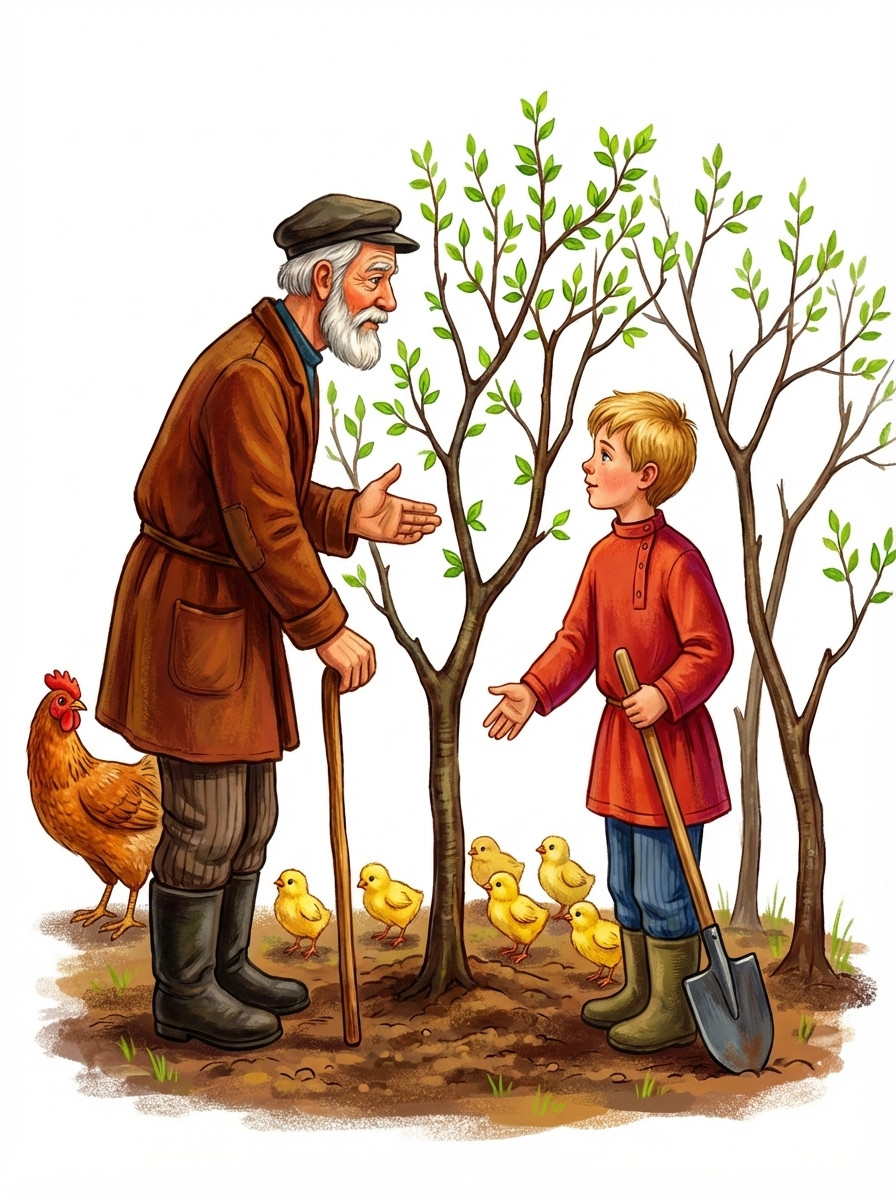 Рассказ о том, как у автора за зиму мыши обгрызли кору на молодых яблонях. Он сказал деду, что убил бы всех мышей, если бы смог. Но дед объяснил, что мыши очень нужны многим животным.