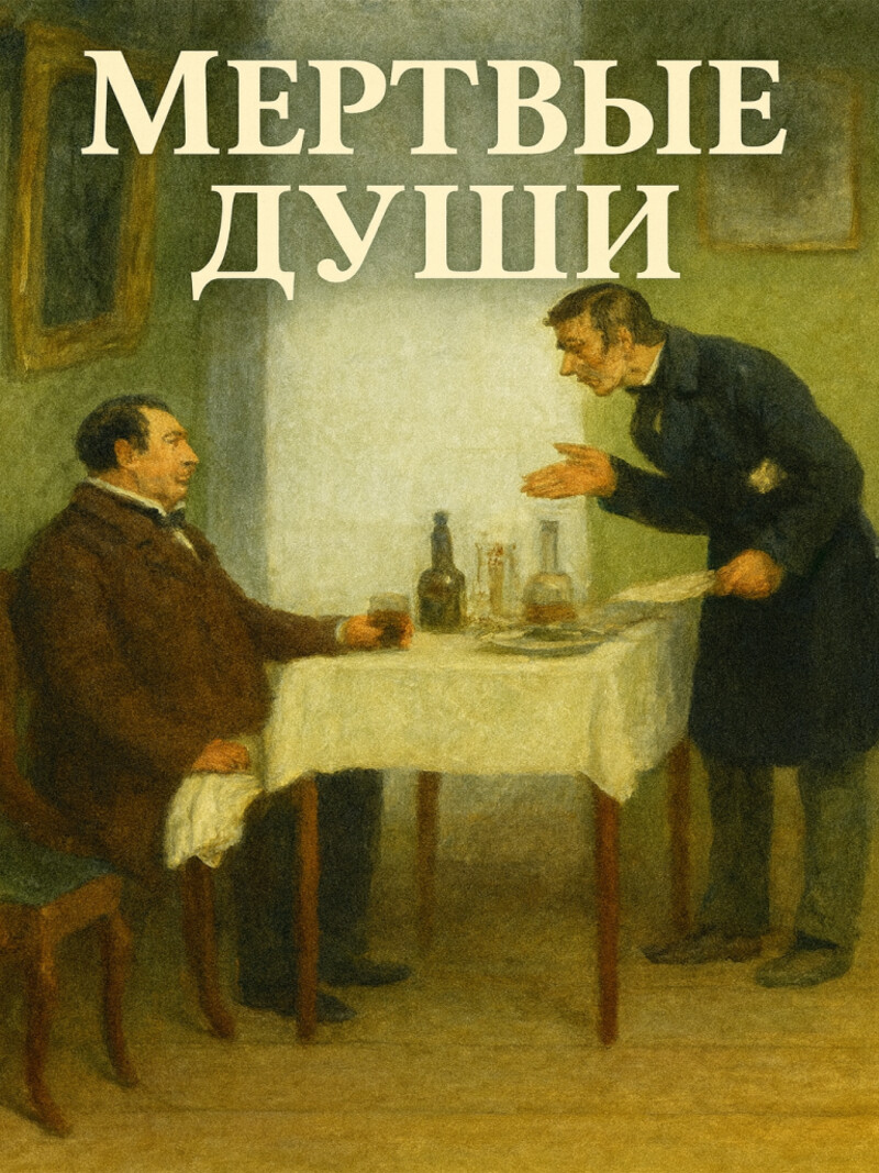 Поэма о похождениях бывшего коллежского советника Павла Ивановича Чичикова, выдающего себя за помещика. Гоголь представляет впечатляющую картину крепостной России. Мёртвые души — это не умершие крестьяне, которых скупал бывший предприимчивый чиновник Чичиков, это и он сам, и его знакомые богатые помещики Собакевич, Ноздрёв, Манилов. Они отдали душевную чистоту за приятные привычки и материальные блага. В их душах не осталось ничего возвышенного.