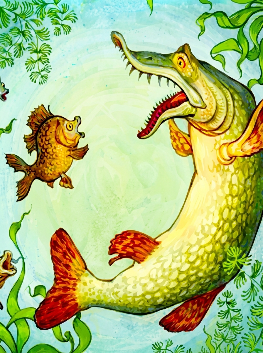 Сказка о том, как карась спорил с ершом как надо жить: карась говорил, что жить надо правдой, а ёрш утверждал, что в жизни без лукавства не проживешь. Однажды приплыла щука и окончила спор...
