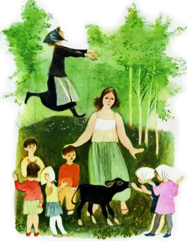 Ребята пошли дальше в лес. Стали играть. Вдруг навстречу им женщина.
