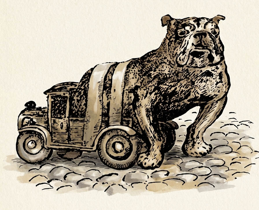 И вот смотрю: выезжает из дверей пятнистая собака — бульдог. Бульдог на колесиках. Туловище у него прибинтовано к игрушечному автомобильчику — грузовичок такой, «газик». А передними лапами бульдог по земле ступает — бежит и сам себя катит.