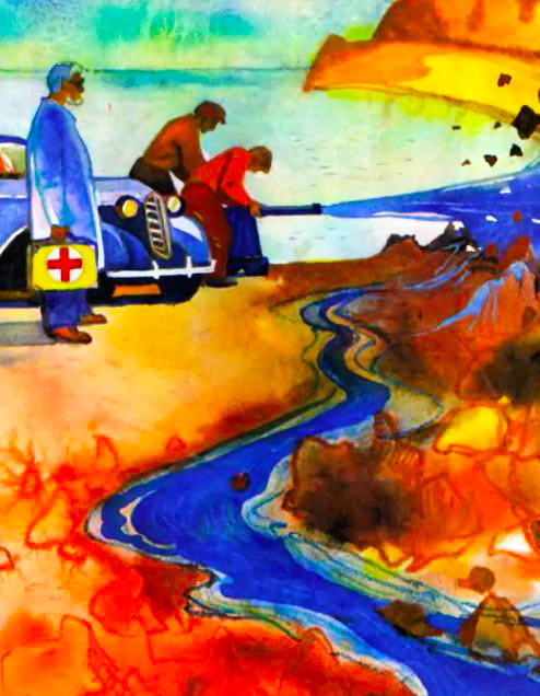 Он спешит на берег моря и, рискуя быть смытым водой, становится на прибрежные камни и кричит, кричит день и ночь, пока не утихнет буря: