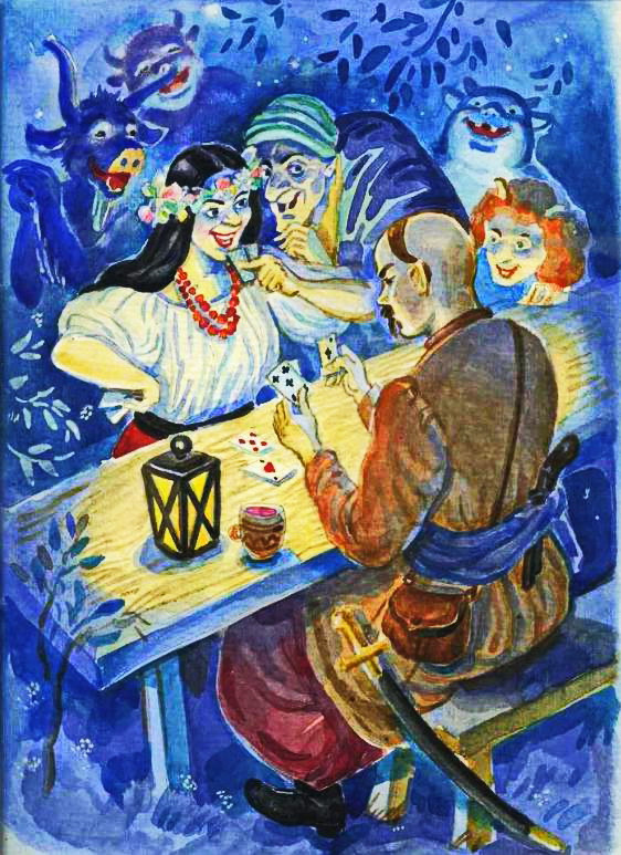 Глядь — в самом деле простая масть. Что за дьявольщина! Пришлось в другой раз быть дурнем, и чертанье пошло снова драть горло: «Дурень, дурень!» — так, что стол дрожал и карты прыгали по столу. Дед разгорячился; сдал в последний раз. Опять идет ладно. Ведьма опять пятерик; дед покрыл и набрал из колоды полную руку козырей.