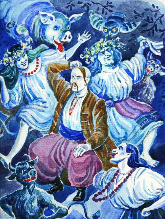 Перекрестился дед, когда слез долой. Экая чертовщина! что за пропасть, какие с человеком чудеса делаются! Глядь на руки — все в крови; посмотрел в стоявшую торчмя бочку с водою — и лицо также. Обмывшись хорошенько, чтобы не испугать детей, входит он потихоньку в хату; смотрит: дети пятятся к нему задом и в испуге указывают ему пальцами, говоря: «Дывысь, дывысь, маты, мов дурна, скаче!» (Смотри, смотри, мать, как сумасшедшая, скачет! (Прим. Н.В. Гоголя.)) И в самом деле, баба сидит, заснувши перед гребнем, держит в руках веретено и, сонная, подпрыгивает на лавке. Дед, взявши за руку потихоньку, разбудил ее: «Здравствуй, жена! здорова ли ты?» Та долго смотрела, выпуча глаза, и, наконец, уже узнала деда и рассказала, как ей снилось, что печь ездила по хате, выгоняя вон лопатою горшки, лоханки, и черт знает что еще такое. «Ну, — говорит дед, — тебе во сне, мне наяву. Нужно, вижу, будет освятить нашу хату; мне же теперь мешкать нечего». Сказавши это и отдохнувши немного, дед достал коня и уже не останавливался ни днем, ни ночью, пока не доехал до места и не отдал грамоты самой царице. Там нагляделся дед таких див, что стало ему надолго после того рассказывать: как повели его в палаты, такие высокие, что если бы хат десять поставить одну на другую, — и тогда, может быть, не достало бы. Как заглянул он в одну комнату — нет; в другую — нет; в третью — еще нет; в четвертой даже нет; да в пятой уже, глядь — сидит сама, в золотой короне, в серой новехонькой свитке, в красных сапогах, и золотые галушки ест. Как велела ему насыпать целую шапку синицами, как… всего и вспомнить нельзя. Об возне своей с чертями дед и думать позабыл, и если случалось, что кто-нибудь и напоминал об этом, то дед молчал, как будто не до него и дело шло, и великого стоило труда упросить его пересказать все, как было. И, видно, уже в наказание, что не спохватился тотчас после того освятить хату, бабе ровно через каждый год, и именно в то самое время, делалось такое диво, что танцуется, бывало, да и только. За что ни примется, ноги затевают свое, и вот так и дергает пуститься вприсядку.