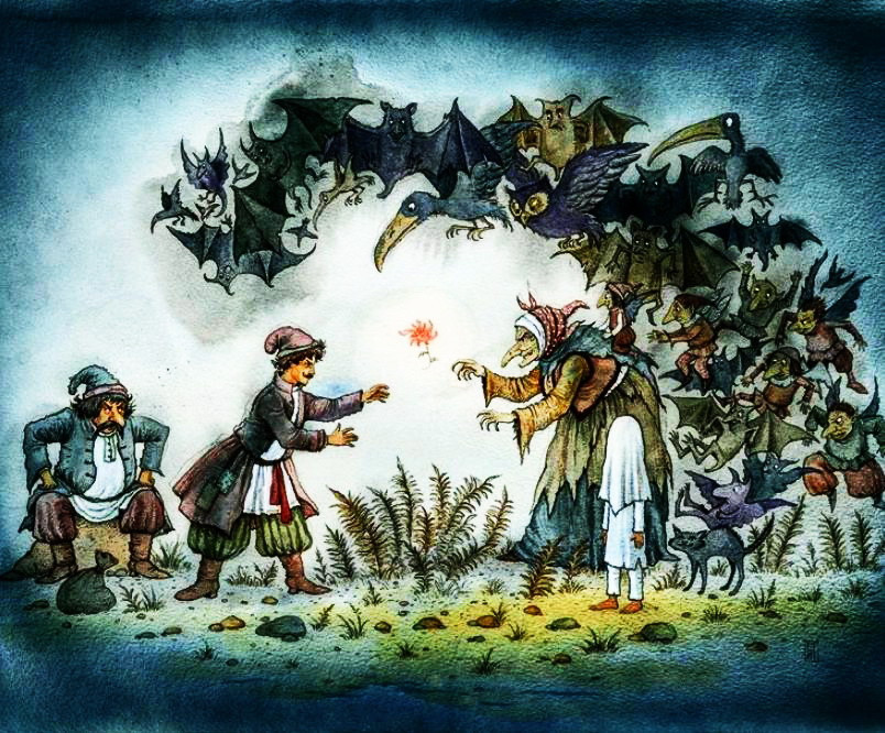 — Видишь ли ты, стоят перед тобою три пригорка? Много будет на них цветов разных; но сохрани тебя нездешняя сила вырвать хоть один. Только же зацветет папоротник, хватай его и не оглядывайся, что бы тебе позади ни чудилось.