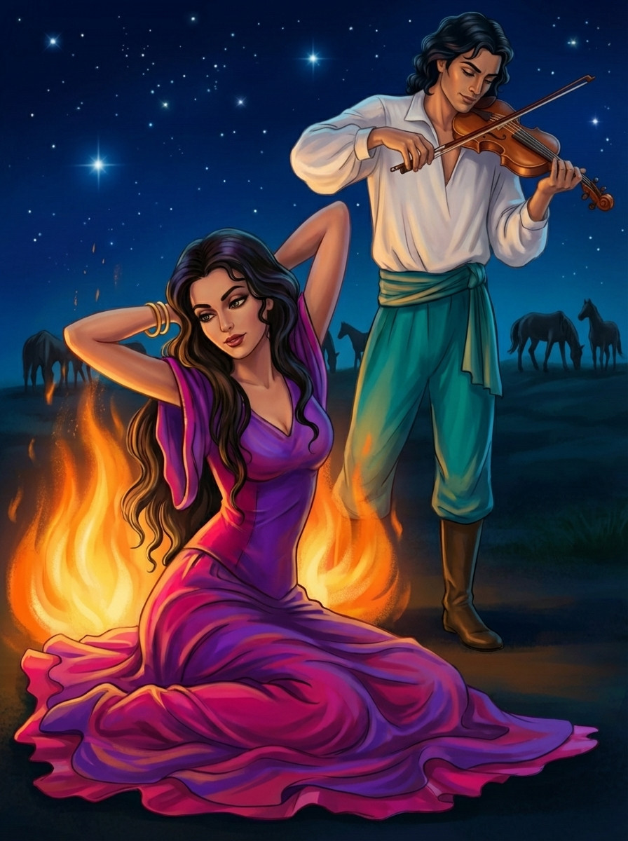 Они шли, пели и смеялись; мужчины – бронзовые, с пышными, черными усами и густыми кудрями до плеч, в коротких куртках и широких шароварах; женщины и девушки – веселые, гибкие, с темно-синими глазами, тоже бронзовые. Их волосы, шелковые и черные, были распущены, ветер, теплый и легкий, играя ими, звякал монетами, вплетенными в них. Ветер тек широкой, ровной волной, но иногда он точно прыгал через что-то невидимое и, рождая сильный порыв, развевал волосы женщин в фантастические гривы, вздымавшиеся вокруг их голов. Это делало женщин странными и сказочными. Они уходили всё дальше от нас, а ночь и фантазия одевали их всё прекраснее.