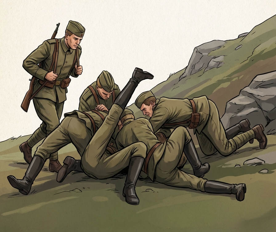 Солдаты «противника» привели Башмакова в свой лагерь, в палаточный городок, и стали допрашивать.