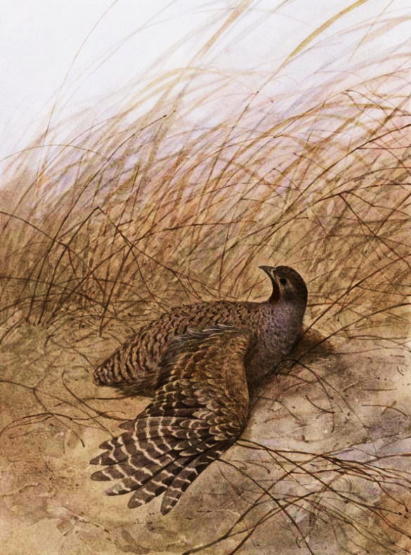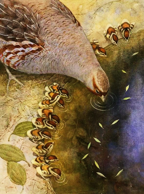Солнце стояло высоко и грело жарко. Чтобы добраться до воды, надо было пройти открытую поляну. И вот, высмотрев хорошенько, нет ли поблизости врагов, мать-куропатка собрала малюток под тень своего распущенного веером хвоста и повела их, защищая от солнечного удара, к зарослям шиповника на берегу ручья.