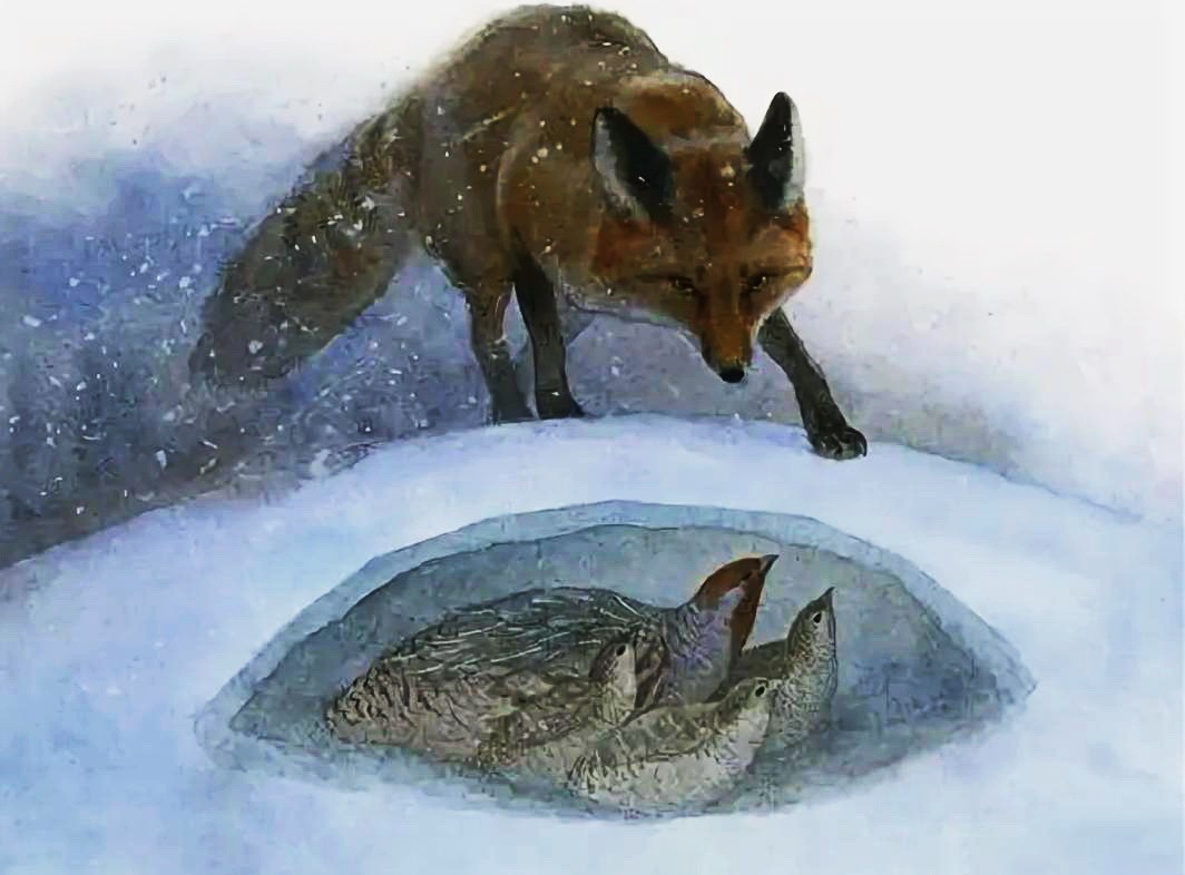Это была их первая ночь, проведенная в снежном сугробе. На следующую ночь они опять нырнули в сугроб, и северный ветер снова прикрыл их белой простынкой. Но погода изменилась, и ночью ветер подул с востока. Сначала шел дождь со снегом, потом все покрылось льдом, и когда утром куропатки проснулись и захотели выбраться из своих убежищ, оказалось, что они были заперты под твердым покровом льда.