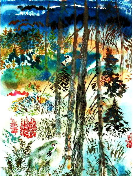 Но вот вошёл в него охотник — и мигом всё спряталось и насторожилось. Как волна от брошенного в воду камня, покатилась от дерева к дереву тревога. Все за кусток, за сучок — и молчок.