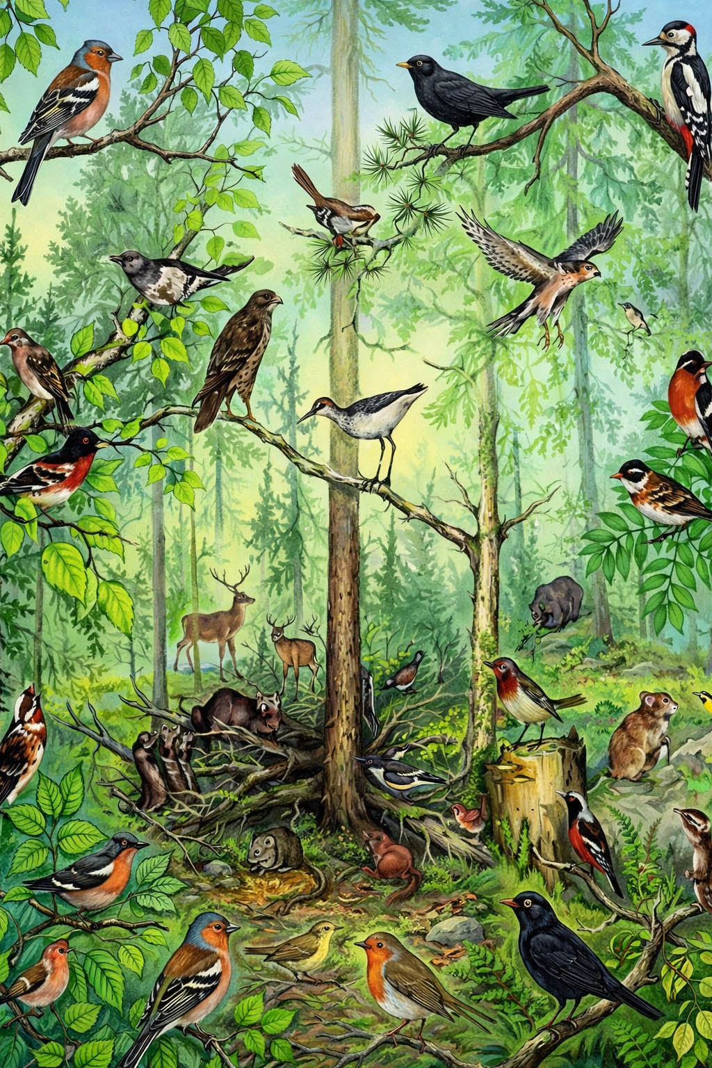 Лес густой, зелёный и полон шорохов, писков, песен.