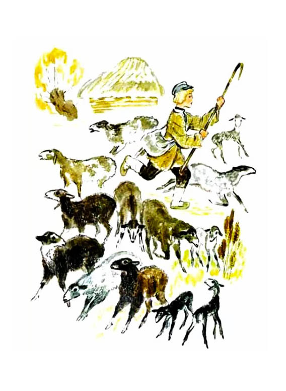 Лебеди стадом летели из холодной стороны в тёплые земли. Они летели через море. Они летели день и ночь, и другой день и другую ночь они, не отдыхая, летели над водою. На небе был полный месяц, и лебеди далеко внизу под собой видели синеющую воду. Все лебеди уморились, махая крыльями; но они не останавливались и летели дальше. Впереди летели старые, сильные лебеди, сзади летели те, которые были моложе и слабее.