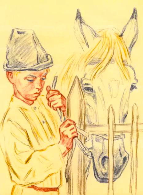 У Розки были щенки на дворе, на сене. Розка ушла. Дети пришли и взяли щенка и снесли на печку.