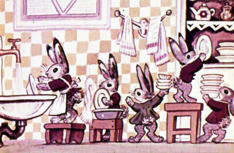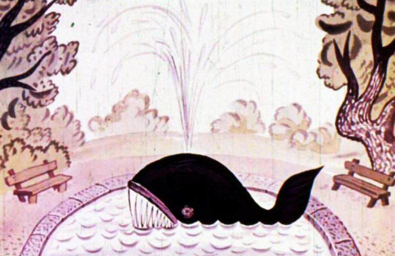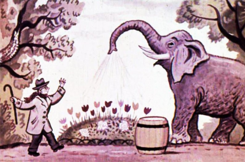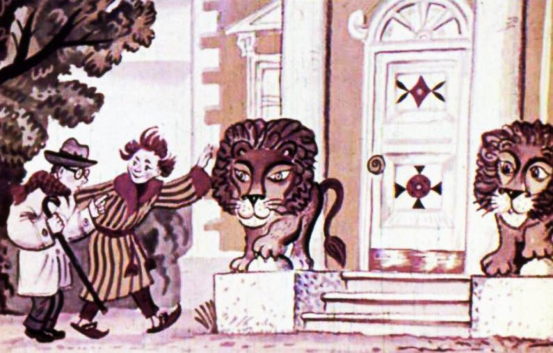 Слон цветы поливает. Медведь с подносом идёт и несёт хозяину лимонад. Пила-рыба пилит дрова. Обезьянка на крыше трубу чистит. Дятел носом приколачивает доску, которая отвалилась. А у крыльца на лестнице лежат два огромных льва и хвостами машут.