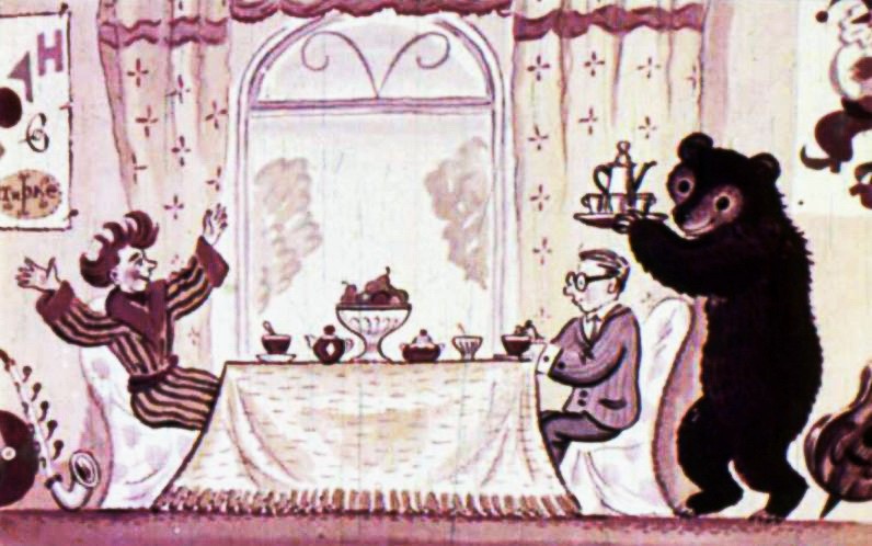 И я сел с хозяином за столик, и медведь принёс на подносе какао.