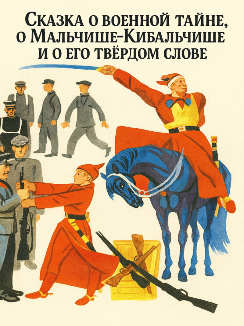 Рассказ про про военную тайну и храброго Мальчиша-Кибальчиша, который не выдал военную тайну буржуям, и что не будет им победы над простым народом, сколько бы они в сырых тюрьмах не запирали простых людей.