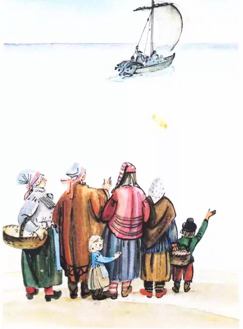В одном рыбачьем поселке был неудачливый год и все голодали. Рыбаки решили выйти в море и старый рыбак дал им с собой волшебный платок с тремя узелками.