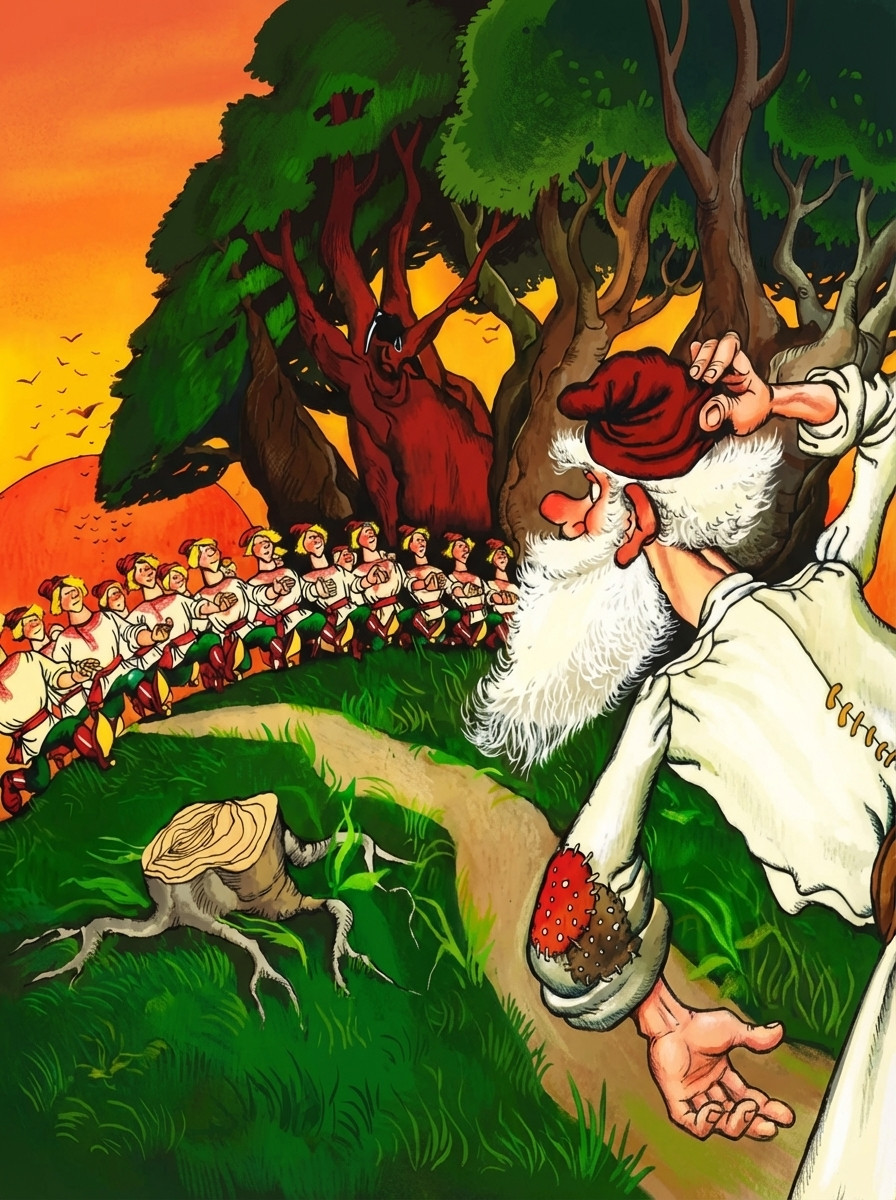Купцы думали, думали: «На что нам дубинка, топор да дудка? Лучше поменяться, со сватом Наумом будем безо всякой заботы день и ночь и сыты и пьяны».