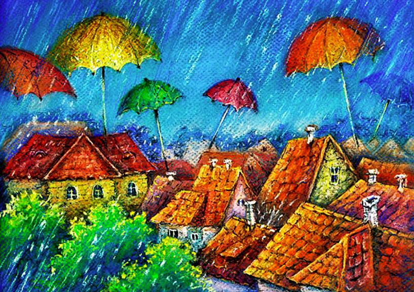 — Глупый я, беззаботный я,— плакал дождь. Плакал, плакал, плакал… И слезы его упали на землю. Поток слез. И встали цветы — ожили! И весело зашелестели листья — ожили! И вздохнули легко люди — ожили!