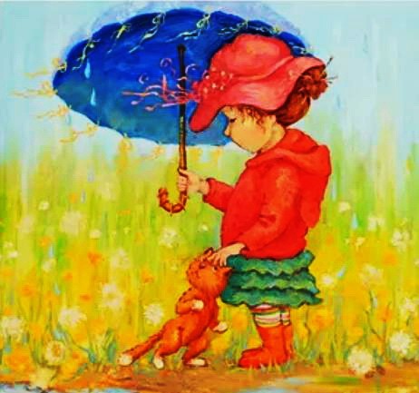Люди, цветы, листья обрадовались. Ждут. Смеются. Дождь торопится, распустил волосы-струи, поливает.