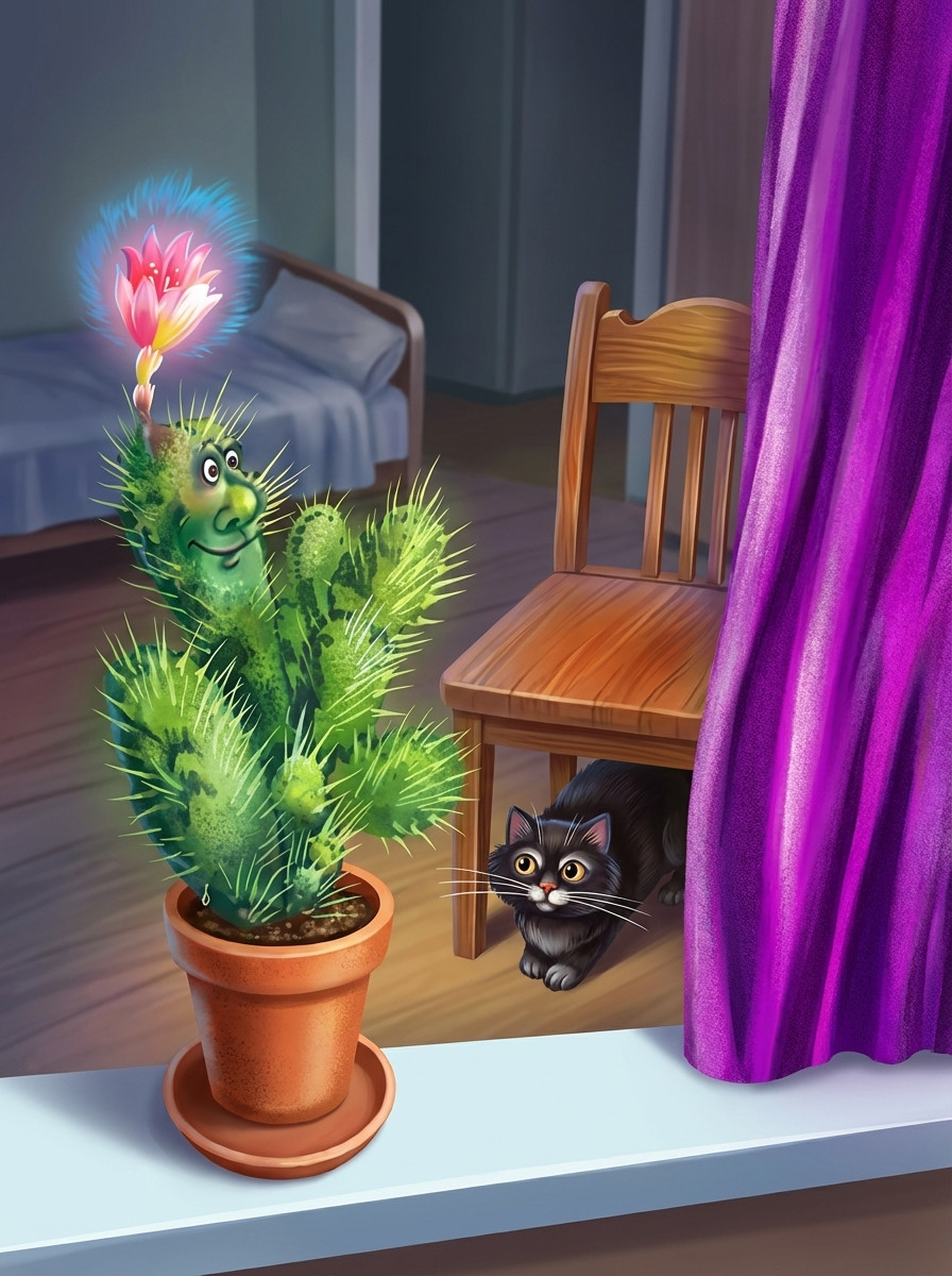 Посмотрела в окно. Удивилась. Потому что небо стало не голубым, а очень темно-серым, солнца не было видно вообще. Да еще и дождь полил. Ливень просто. «Ничего себе,— Мурзета, не спеша, спрыгнула с подоконника,— дождь-то какой… Придется переждать непогоду. А потом уж поедем». И она хотела свернуться в клубочек и поспать. Но в это время…