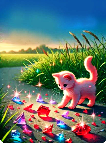Маленький обыкновенный котенок, как зачарованный, смотрел на стеклышко. Котенок прижался к пыльной траве, чтобы стеклышко его не видело, и старался угадать, куда бросит солнышко этот луч или тот. Угадывал он или ошибался — все равно ему страшно хотелось схватить зайчика, появлявшегося на траве. Сначала котенок стеснялся, а потом подошел к красному стеклышку. Вежливо поздоровался и сказал: