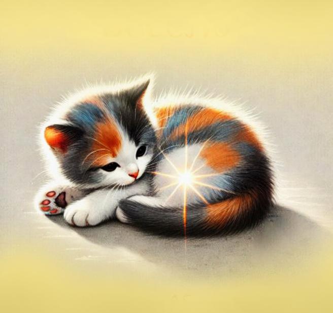 Не успел уснуть, а ему уже весело. Тихо-тихо, чтобы не спугнуть веселое настроение, котенок фыркнул, открыл глаза и увидел на кончике своего хвоста небольшое яркое пятнышко. Светлое пятнышко шевельнулось и перепрыгнуло котенку на нос. Очень щекотно стало.