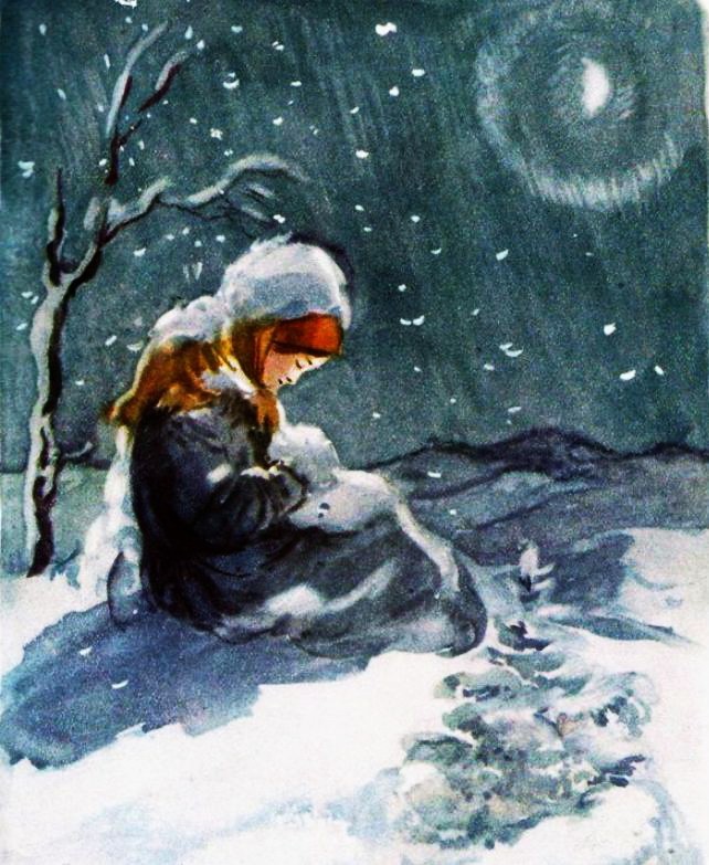 Вот она, значит, и шлепает да шлепает. Сперва-то вовсе ходко шла. Верст, поди, пятнадцать, а то и все двадцать отхватила. Одежонка у ней не больно справная, а итти не холодно, жарко даже: снегу-то насыпало, почитай, на две четверти, еле ноги вытаскивает,– вот и согрелась. А снег-то все идет да идет. Еще ровно дружнее стал. Богатство прямо. Васенка и притомилась, из сил выбилась, да на дороге и села.