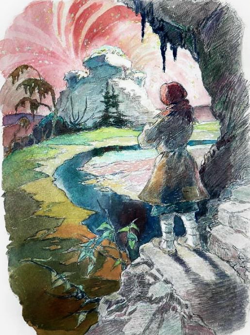 «Вот где,– думает,– никому из руднишных меня не найти», — и стала опускаться по ступенькам. Долго спускалась и вышла на большое-большое поле. Конца-краю ему не видно. Трава на этом поле кустиками и деревья реденько, — все пожелтело, как осенью. Поперек поля река. Черным-чернехонька, и не пошевельнется, как окаменела. За рекой, прямо перед Васенкой, горочка небольшая, а на верхушке камни-голыши: посредине- как стол, а кругом — как табуреточки. Не по человечьему росту, а много больше. Холодно тут и чего-то боязно.