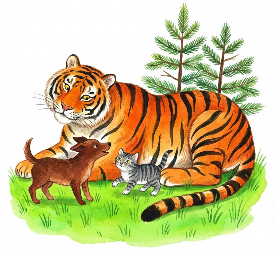 Но как–то сердитый тигр, встретил маленького котёнка. И хотел он уже зарычать, но взглянул на его усы и понял: да это же маленький тигр!