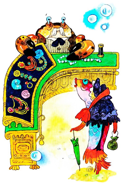 – Увы, мадам, вы ошибаетесь. Это не жемчужина, а бородавка. К сожалению, я это слишком хорошо знаю. У моей покойной супруги на правой клешне была точно такая же бородавка, только, разумеется, меньших размеров. Она выросла оттого, что на клешню попала песчинка, а моя покойная супруга своевременно не обратила на это внимания. Конечно, бородавка продолжала бы расти и до сих пор, если бы моя супруга по неосторожности не попала в сачок к мальчику, который ловил креветок. Кроме того, вам должно быть известно, сударыня, что жемчуг рождается на внутренних створках особых раковин, которые так и называются «жемчужницы». Но я никогда не слышал, чтобы жемчуг рождался под плавником у рыбы, хотя и такой прекрасной, как вы, сударыня…