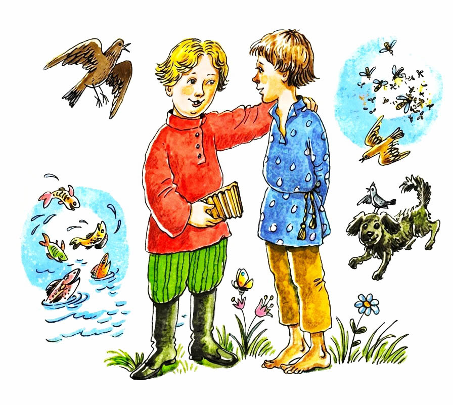 Накупил Костя разных разностей, орехов-сладостей и семиголосую гармошечку. Идет Костя домой и всех угощает разными разностями, орехами-сладостями. И птиц, и рыб, и пчел.