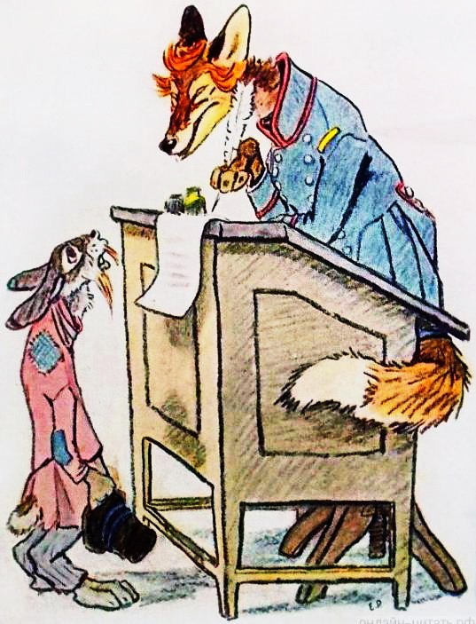 Села лиса по-собачьему и заиньку присесть пригласила; и он ножки под себя поджал. Поджал, сердечный, и все сам с собой рассуждает: «Как, мол, я ожидал, так, по-моему, и вышло. Всякому зверю свое житье: льву — львиное, лисе — лисье, зайцу — заячье. Ну-тка, вывози теперь, заячье житье!»