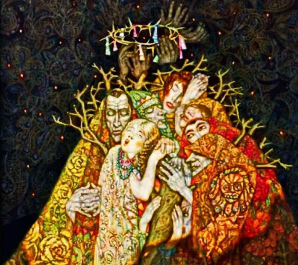 Вокруг Сатаны, словно черви, кишели дьяволы, демоны, бесы и всякая нечисть; рожи корявые, спины горбатые, на макушках рога; груди волосатые, на ногах копыта, а через плечи перевиты хвосты — у одних, как у лошади, у других, как у собаки, а у иных, как у ящерицы.