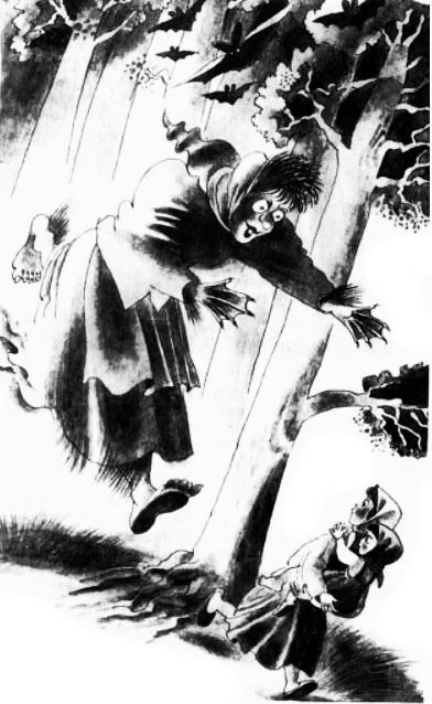 А сзади — погоня: вырвалась кикимора, мчится вдогонку, визжит, на сажень кверху подсигивает…