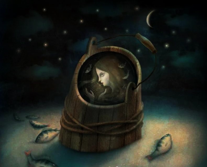 Набрал дед тряпья, в углу на печке гнездо устроил, в головах шапку старую положил, отнес туда русалку, а чтобы тараканы не кусали — прикрыл решетом.