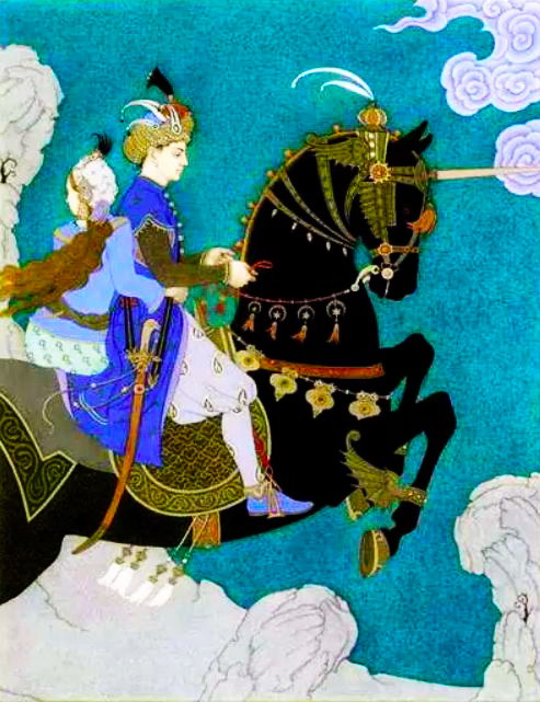 Облачился он с головы до ног в черное, взял с собой лютню и отправился в путь-дорогу. Увидала его мать, не признала: стоит перед ней юноша — и молод, и хорош собой.