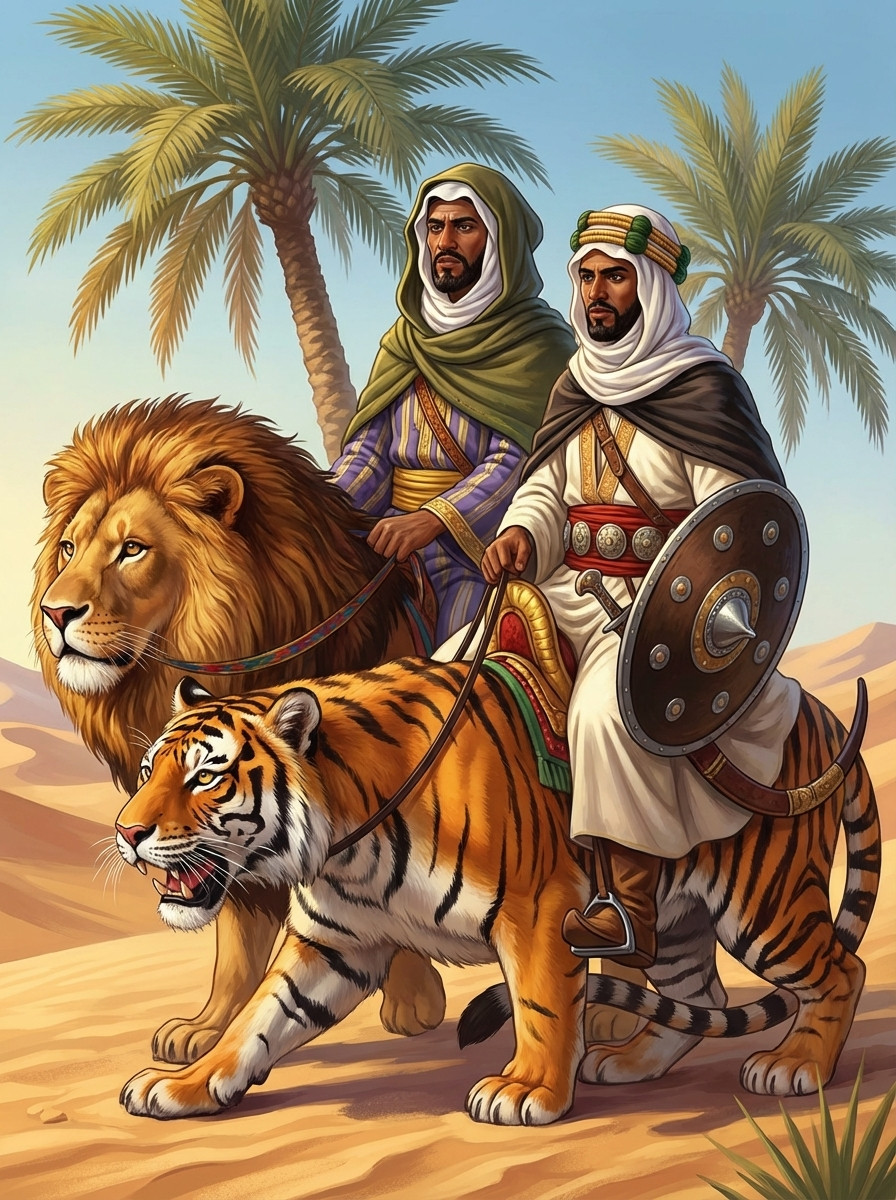 Когда преодолели они семь пустынь, волк превратился из верблюда в коня. Конь быстро пересек семь гор, и они вышли к морю. Тут волк превратился в большого лебедя. На этот раз принц запасся водою и мясом, сел вместе с принцессою на птицу, и она пронесла их через семь морей. Опустились они на землю, и волк принял обычный свой вид, и все они продолжили путь, покуда не добрались до дворца царя — владельца коня.