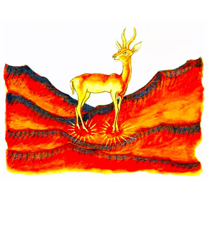 Вскочил юноша на спину коня, и тот резво побежал по долинам и через горы, не чувствуя усталости. Он преодолел семь гор и выбежал к первой пустыне. Там волк превратился из коня в верблюда: Юноша сел на него, и начался путь через семь пустынь. Шли они, шли и пришли в оазис, напились воды, поели вкусных свежих плодов и снова тронулись в путь. На краю последней, седьмой, пустыни неожиданно увидели они дворец дивной красоты, окруженный пышным садом, и в том саду прогуливалась прекрасная принцесса, красота которой затмевала луну. Юноша схватил девушку, усадил ее рядом с собою на верблюда, и пустились они в обратный путь.