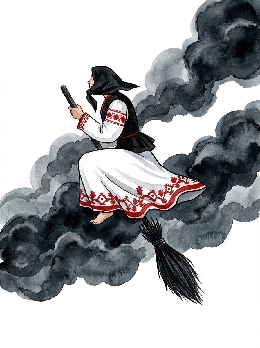 Легли они спать. Только задремал молодой муж, чует — жена с постели тихонько поднимается. Он один глаз приоткрыл, А она шасть к запечку, где метла стояла, берёт её да верхом садится.