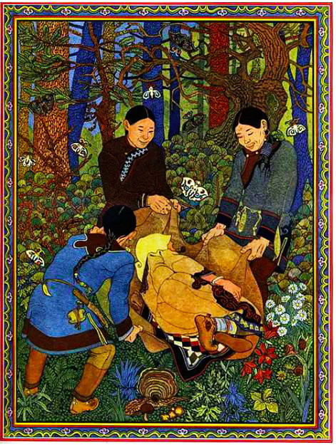 Жил-был на свете старик, и было у него семеро сыновей. Все сыновья женились и привели в дом семь невесток. Вот однажды невестки испекли из муки нового урожая семь толстых, румяных горячих лепешек-пажалу и вынесли их в сени остудить. У младшей невестки выпала Пажалу из рук и покатилась быстро-быстро: из сеней — на дорогу, по дороге — в поле. Побежали было за ней все семеро невесток, да не смогли догнать.
