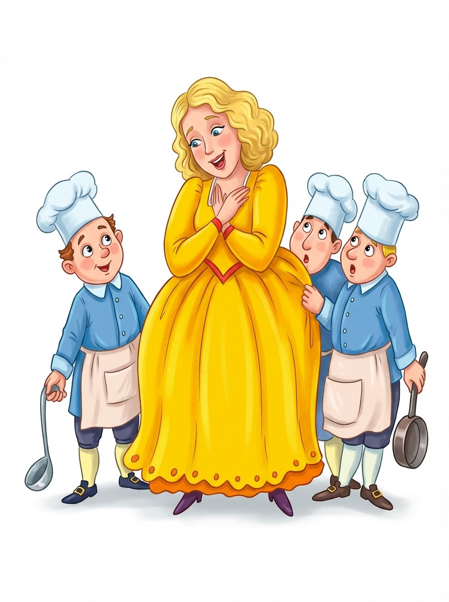 Голод мучит богатырей, жажда томит, есть и пить им хочется. Вот увидели они впереди на горе деревню из шести домов под одной крышей. Поехал вперед Сьер-батор поискать-попросить в деревне хлеба насущного, воды животворной. Подъезжает он и смотрит в окно крайнего дома: а там, на серебряном стуле сидит красавица со змеиным хвостом, на лбу у нее две звезды, на груди две звезды и в ушах по звезде. Сидит она, ребенка в зыбке укачивает и напевает: