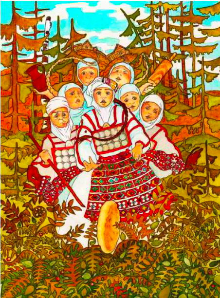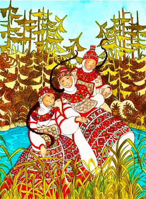 — Едут три брата-богатыря, едут убийцы твоего отца, едут голодные, жаждой томимые, сильно усталые. Хотят они свет найти, солнце и луну спасти, победить моего отца, твоего дедушку. Вот выйду я им навстречу, стану мягкой постелью-периной, не стерпят они, лягут отдохнуть и погибнут… А если кто-то слышит мои слова и передаст другим, тот сам станет пухом белым…